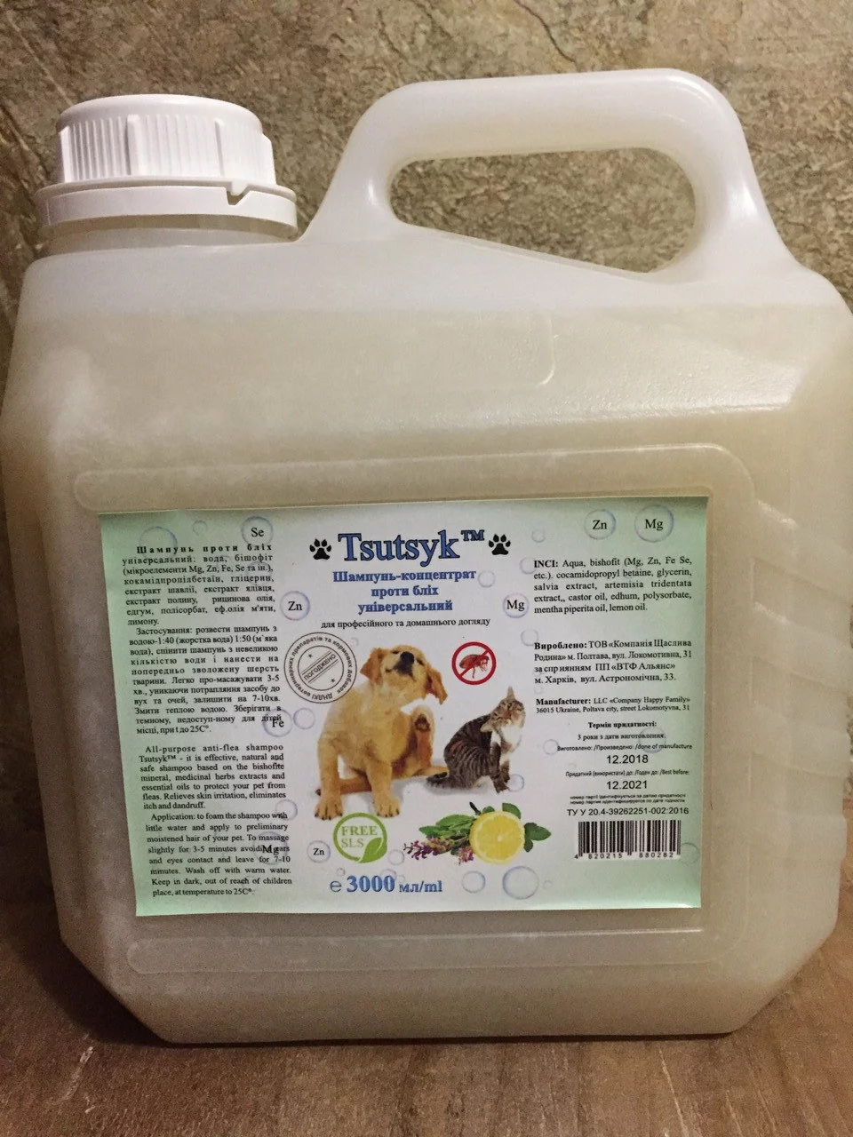 езсульфатный Шампунь - концентрат Tsutsyk ™ от блох - это эффективное, натуральное и безопасное моющее средство на основе экстрактов лекарственных трав и эфирных масел для защиты вашего любимца от блох. Снимает раздражение кожи, устраняет зуд и перхоть. Применение: развесит шампунь с водой1:50(мягкая вода) или 1:40(жёсткая) нанести на предварительно увлажненную шерсть животного. Слегка помассировать 3-5 мин.,избегая попадания средства в уши и глаза, оставить на 7-10мин. Смыть теплой водой. Хранить в темном, недоступном для детей месте, при t до 25С °. Срок годности: 3 года с даты изготовления